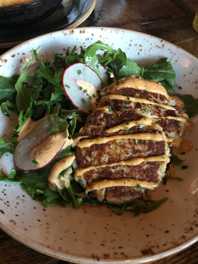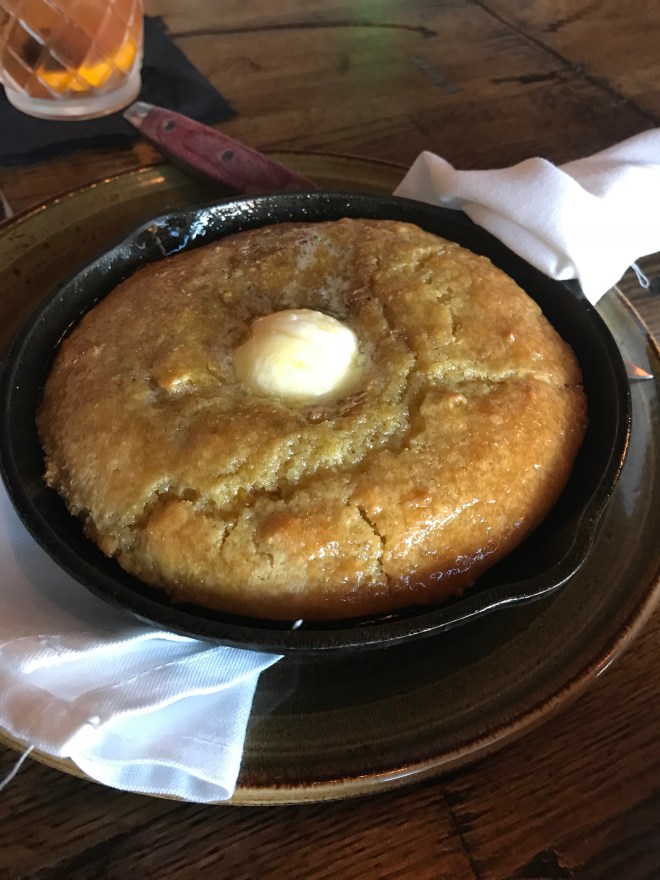 By this time, we were in too deep. We were there for the night. Fried green tomatoes, cornbread and crab cakes rounded out the starters. Scott was mostly excited for the cornbread but for some reason, it didn’t quite hit the spot for him. Don’t get me wrong, it was still good and we’ll probably give it another try to make sure it wasn’t an off night. Gulf shrimp though was the star of the evening. Picture not shown below because we were so excited to start eating that I forgot to snap a picture. Man in the big red beard didn’t steer us wrong.